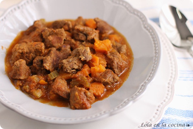 Ya sé que no es muy ortodoxo un curry con ternera ya que en la India no se suele comer este animal, pero ya que ahora todos tenemos un botecito de curry en nuestras despensas, ¿Por qué no usarlo en todo tipo de platos? En casa nos encanta su aroma, y si es un poco picante mucho mejor y os aseguro que este guiso queda delicioso, yo le he puesto unas zanahorias y unos trozos de calabaza por eso del régimen, y le van de maravilla. La verdad es que antes apenas usaba la calabaza en los guisos, no me hacía gracia su textura, pero ahora me he aficionado y se la pongo a casi todo, me gusta mucho el toquecillo que le da a todos los platos.