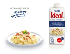 Y es que la Leche evaporada Ideal es estupenda como sustituta de la nata en todos los platos, más cremosa que la leche normal, pero mucho más ligera que la nata pues solamente tiene un 6% de materia grasa, ahora, además viene en un nuevo envase en tetrabrick de 525 gr. con tapón, mucho más cómodo que el antiguo envase y que nos permite una conservación más prolongada en el frigorífico.