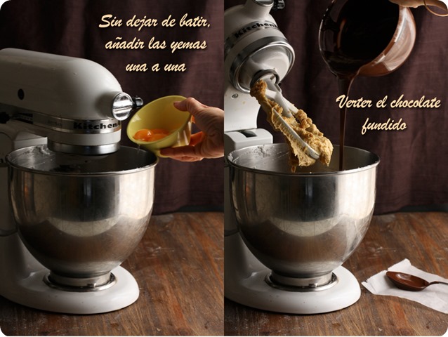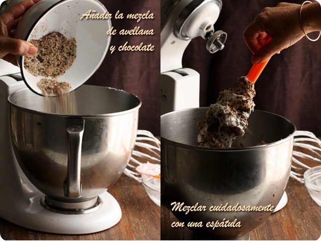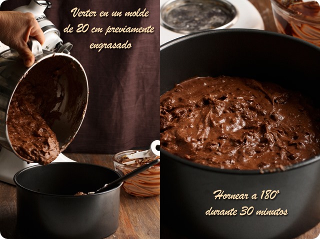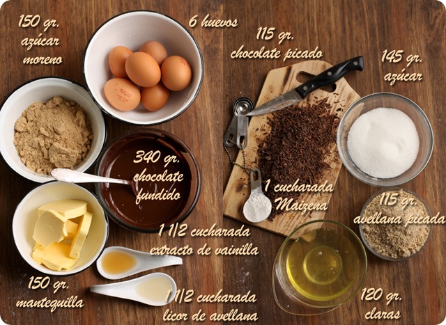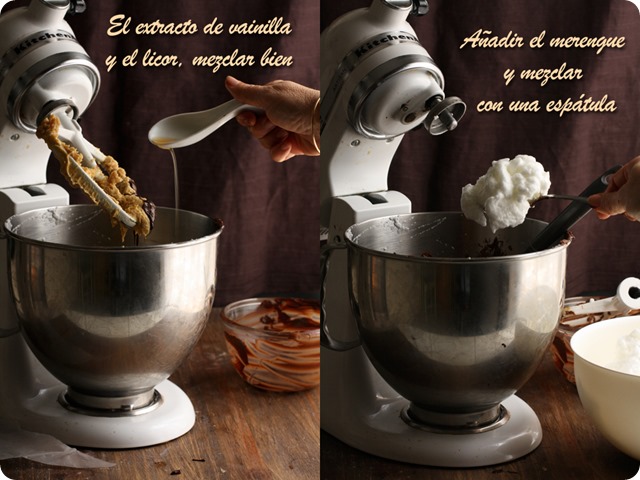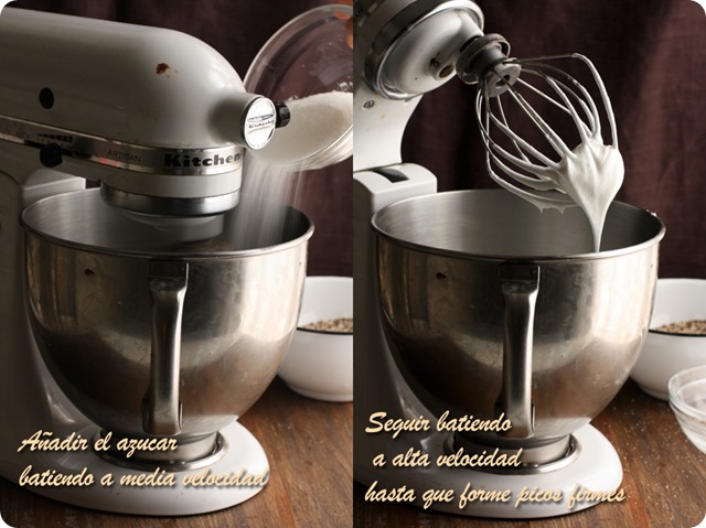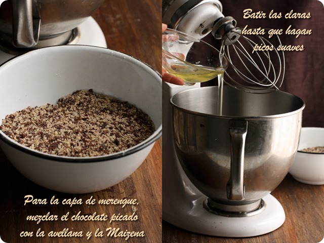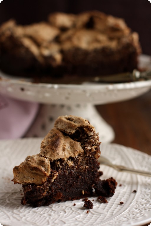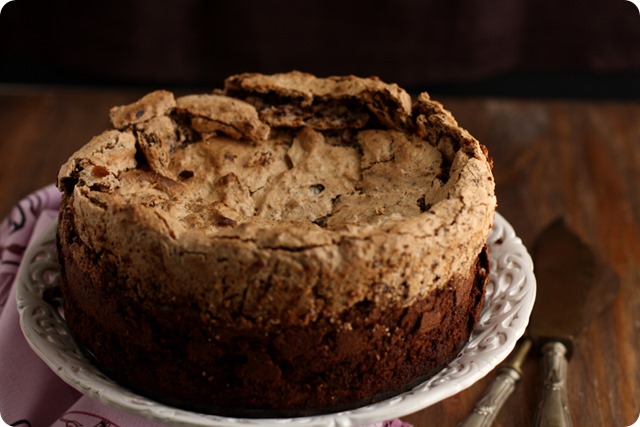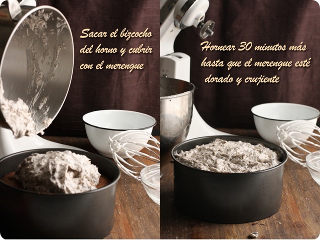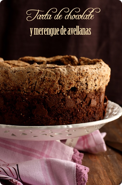 La receta la encontré en el blog de Tartelette, aunque es original de Martha Stewart y solamente he hecho dos mínimos cambios, en lugar de café o ron, lo he aromatizado con licor de avellanas y en lugar de un molde de 23 cm. he usado uno de 20 cm. con lo que la tarta queda más alta y a mi parecer, más bonita. Si la hacéis en un molde de 23 cm. seguramente podréis acortar la cocción en unos 5 /10 minutos. A la salida del horno el merengue estará hinchado, pero enseguida empezará a desinflarse y a resquebrajarse…que no os entre el pánico! Así es como debe ser y seguro que quien la pruebe no os echará nada en cara.