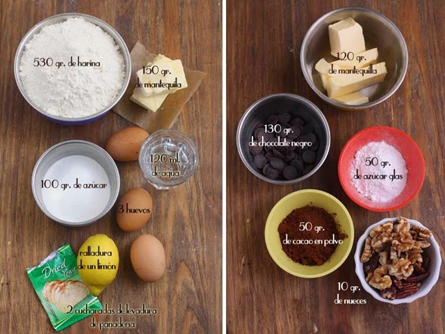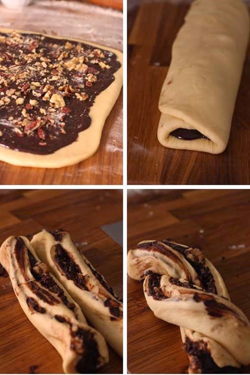 Mientras preparar el relleno: Derretir el chocolate con la mantequilla en el microondas, añadirle el azúcar glas y el cacao, mezclar bien. Dividir la masa en dos porciones, reservar una y extender la otra con el rodillo sobre una superficie ligeramente enharinada hasta tener un rectángulo de unos 38 x 28 cm, untar la mitad de la mezcla de chocolate sin llegar a los bordes, repartir por encima las nueces troceadas y un poco de azúcar.